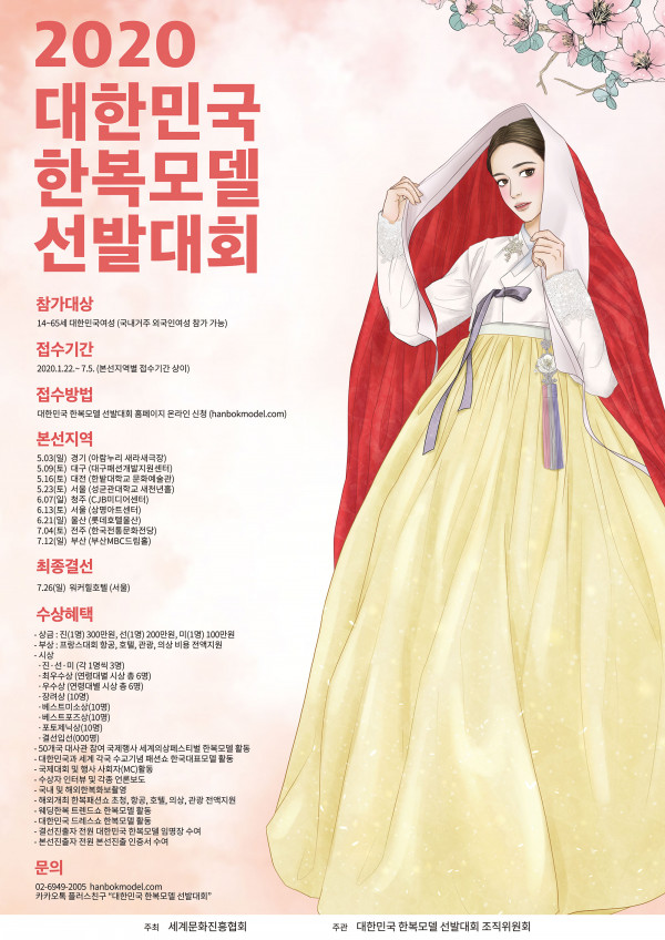 한복의 활성화 및 세계화를 위해 국내외에서 활동할 한복모델을 선발하는 '2020 대한민국 한복모델 선발대회'는 세계문화진흥협회가 주최, 대한민국 한복모델 선발대회 조직위원회 주관으로 진행하며, 올해 3월부터 6월까지 개최한다.